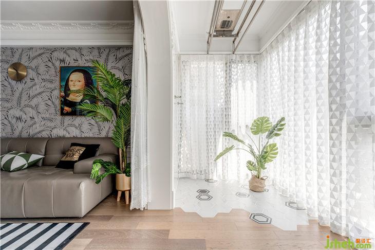 透過心型大門套,地板直鋪到落地窗下口,這邊也自然過渡了跟廚房一樣的六角磚,頂上是生活晾曬區(qū)域,透過幾何半透的落地紗簾,綠植在這里也可以吸收溫暖的陽(yáng)光。