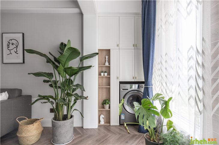 客廳和陽(yáng)臺(tái)之間用門(mén)套分割,模糊兩個(gè)空間的界限。地板從門(mén)廳一路鋪到陽(yáng)臺(tái),使得空間之間有了互動(dòng)性。儲(chǔ)藏柜整體定制,將洗衣機(jī)嵌入其中,形成微妙的平衡。