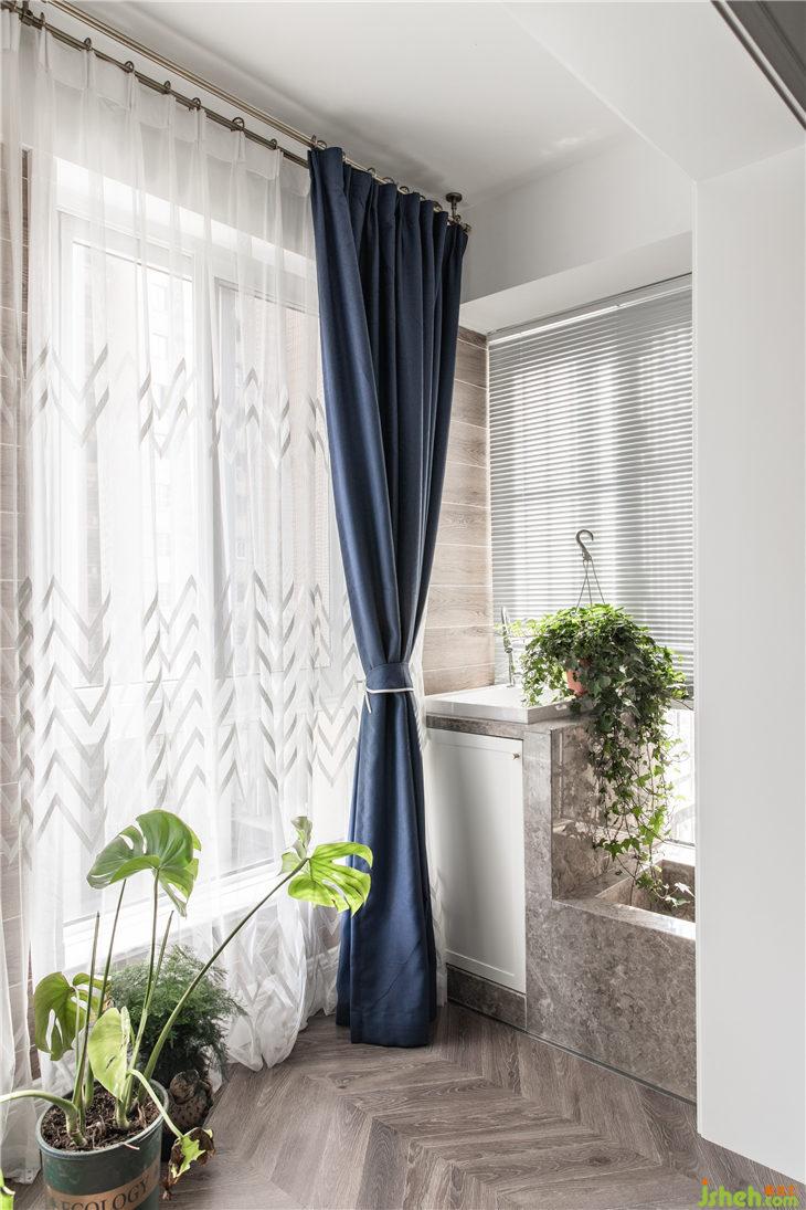 現(xiàn)場(chǎng)砌筑的洗衣池+拖把池組合,用灰色大理石整體包裹,整體性好,又很好的融入客廳空間,百葉窗簾遮擋著西曬的陽(yáng)光。