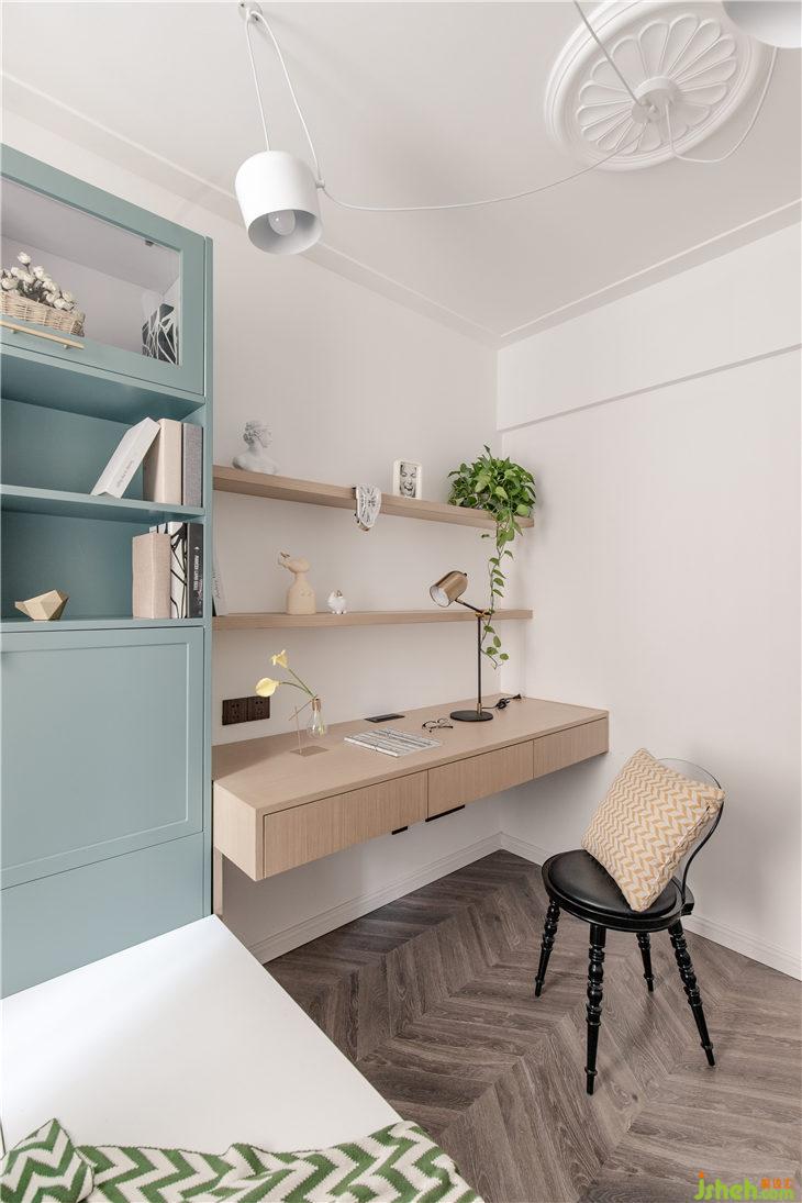 藍(lán)色的小收納柜,成為這個小空間的吸睛點,分層的拼色窗簾,依舊是空間的亮點。