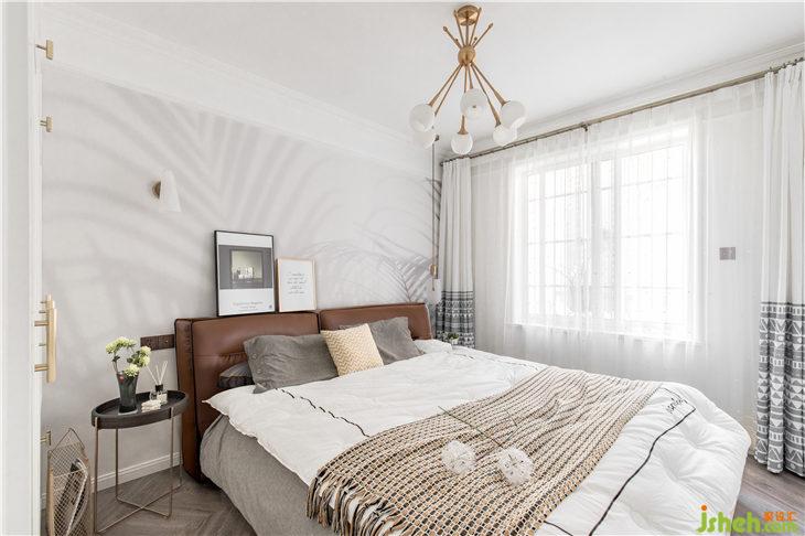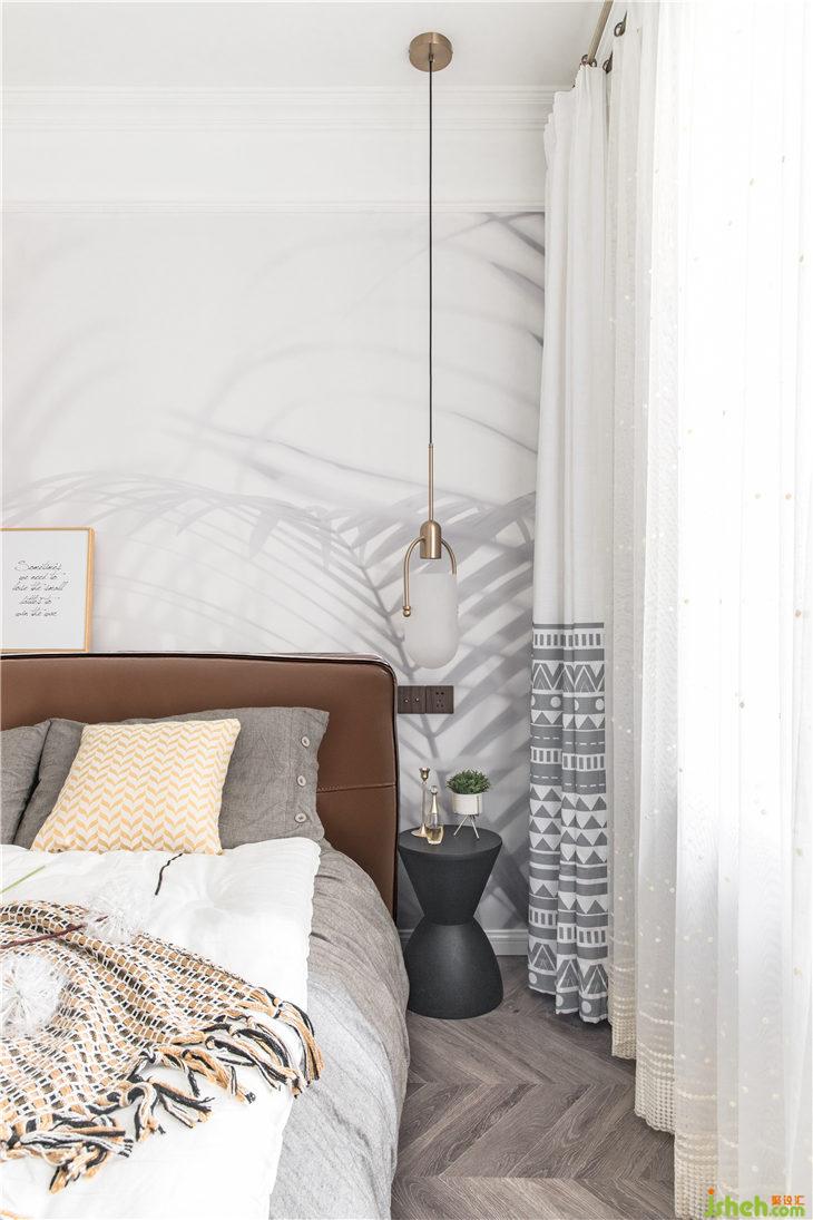 令人舒適的主臥空間,沒有過多的裝飾表現(xiàn),淡淡的枝葉剪影素色壁畫,大面積留白的墻面,為的是一份慵懶撒入室內(nèi)的陽光及那還在追逐的夢想。