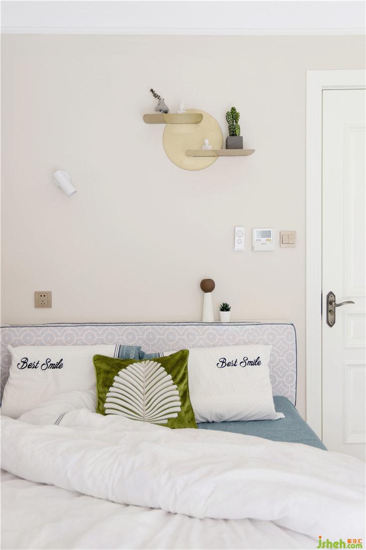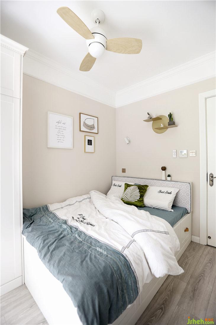 次臥空間不大,與南陽臺相同,采光充裕。放置了一米五的床,定制了一個(gè)窄衣柜,就已經(jīng)充滿了房間;因此我們墻面選用了清新淡雅的白鷺色乳膠漆,搭配暴風(fēng)雨灰色系床品,點(diǎn)綴雪松綠抱枕,讓空間盡量的明亮清爽,單配精選的墻面掛飾和吊扇燈,簡約而又富有生活趣味。