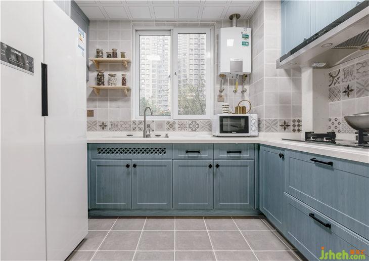 孔雀藍(lán)的柜門是專門定制的,把手特意選了亮金色,凸現(xiàn)氣質(zhì)。