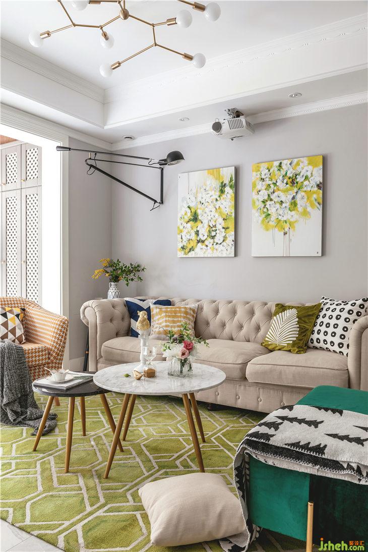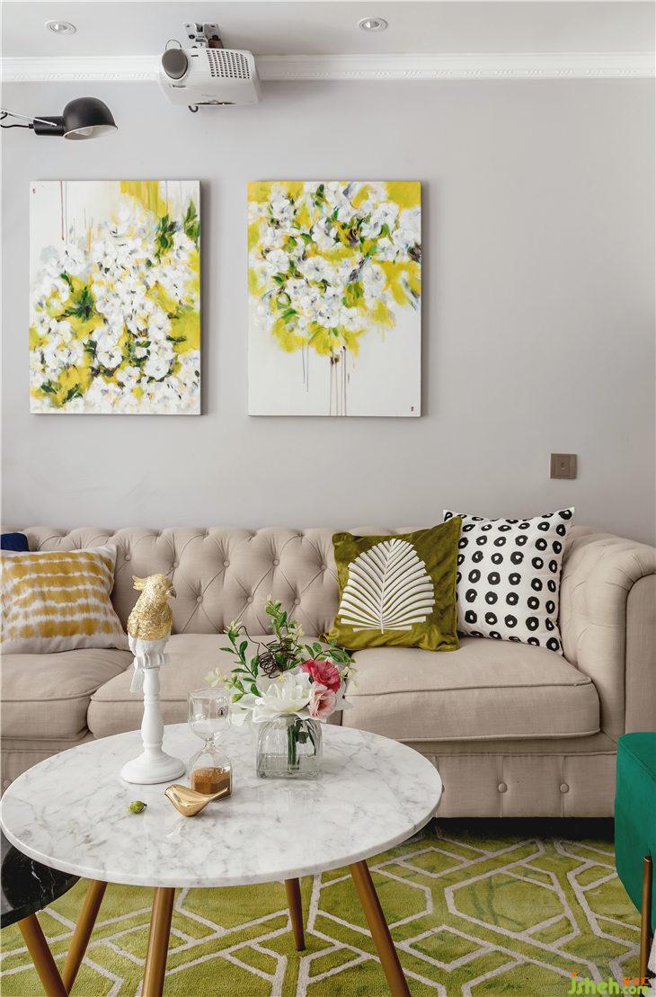 沙發(fā)背景墻,定制了一組芹菜綠花卉掛畫(huà),地面用比背景畫(huà)深一個(gè)色度的菠菜綠沉淀了一下,搭配古典綠的長(zhǎng)踏,整體色調(diào)與陽(yáng)臺(tái)外的綠意盎然交相輝映。