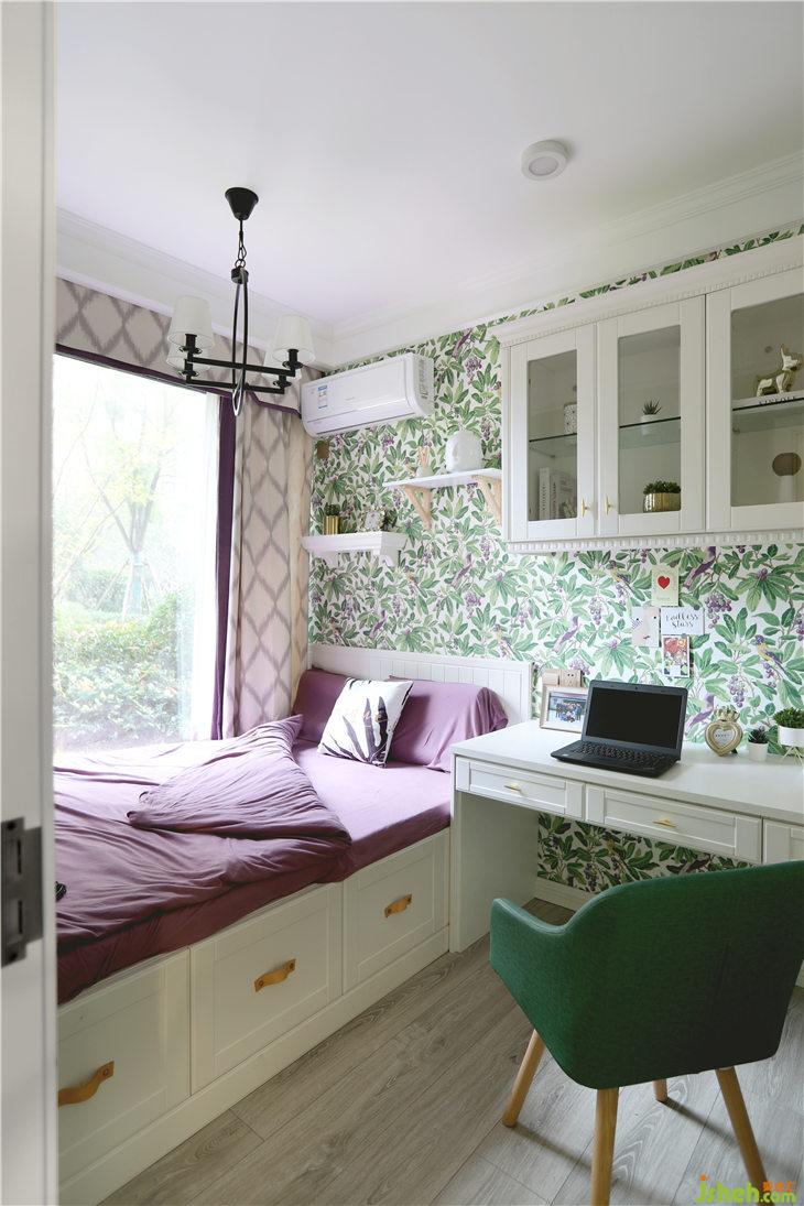 書房我們選用抹茶綠色系花鳥壁紙,壁紙中還局部點綴了絳紫色小鳥,所以我們的窗簾和床品搭配了淺一個度的葡萄汁色,大面積用淺灰綠色乳膠漆,再搭配一個墨綠色的書桌座椅,整體色彩搭配付有飽和度卻不顯得溢滿,依然很好的詮釋了美式的清新沁人。