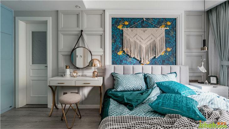 主臥背景用石膏板兩層疊級的做法加強背景層次,利用乳膠漆色彩區(qū)分(銀樺色、白色、淺灰色),突出背景,背后框內(nèi)利用豐富設(shè)計手法維和pu線條,中間點綴海淘花鳥壁紙,掛毯的裝飾減少了壁紙的突兀感。