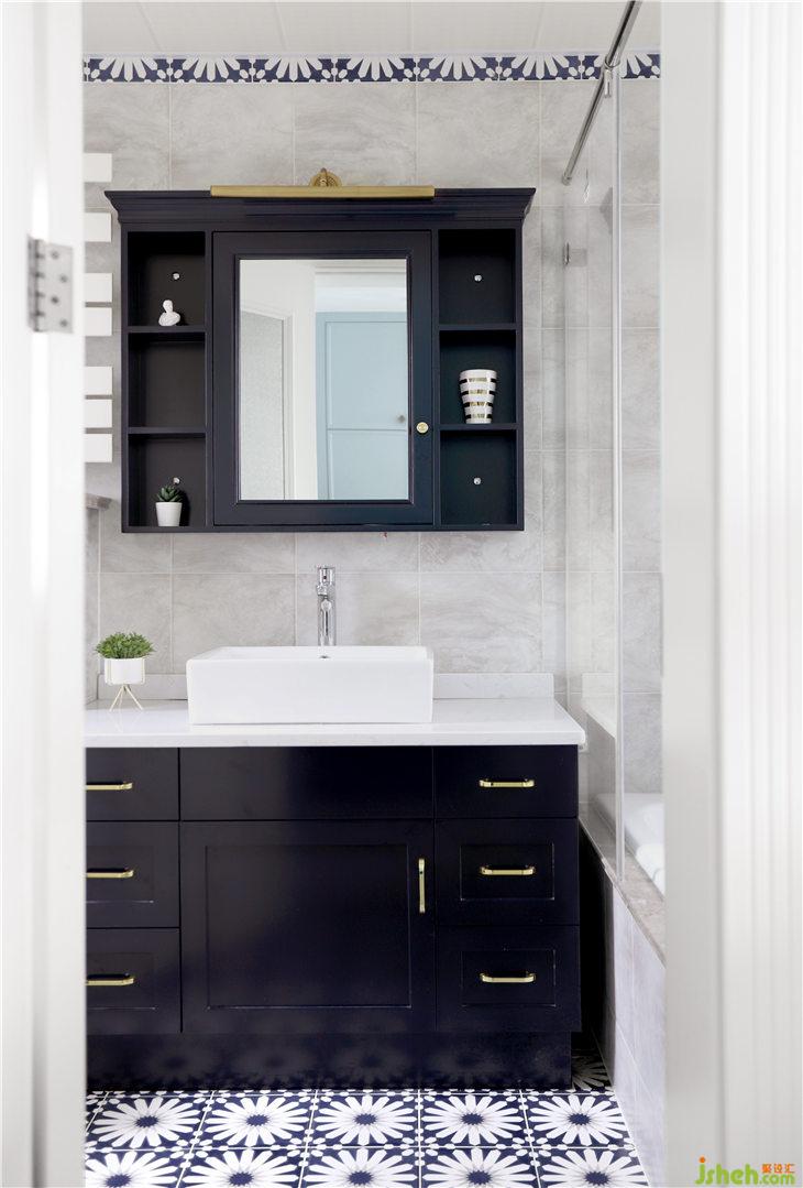 主衛(wèi)主打尊貴氣質(zhì)的藏藍色,淺灰色的復古墻磚搭配落地烤漆臺盆柜,結(jié)合美式儲藏鏡柜,地面搭配美式深藍花磚,色調(diào)中氤氳著冷冽的氣質(zhì),柔和的觸感彰顯了空間優(yōu)雅本色。