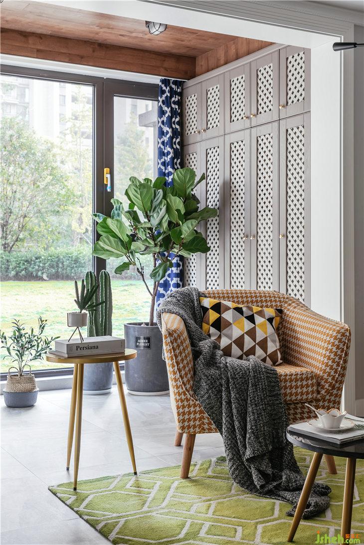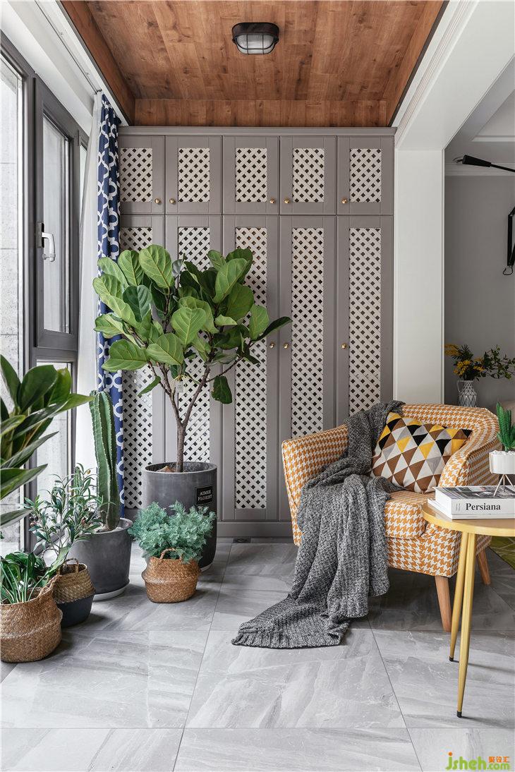 我們將地板鋪在的陽臺吊頂,將更多的復古木色融到空間中,增添休閑典雅的氛圍。