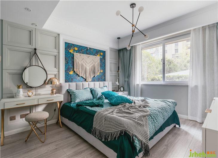 亮眼的孔雀藍和比斯開灣藍配比和諧統(tǒng)一,搭配古典綠床品,兩種神密的色彩疊加,令整個空間充滿了色彩的魅力。