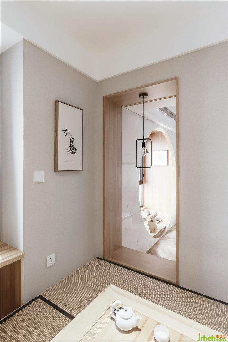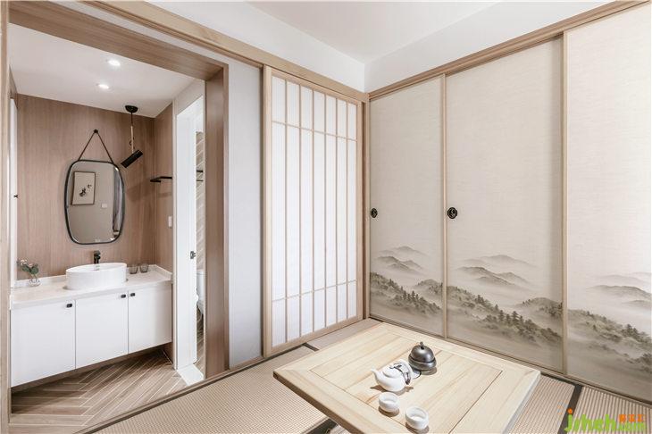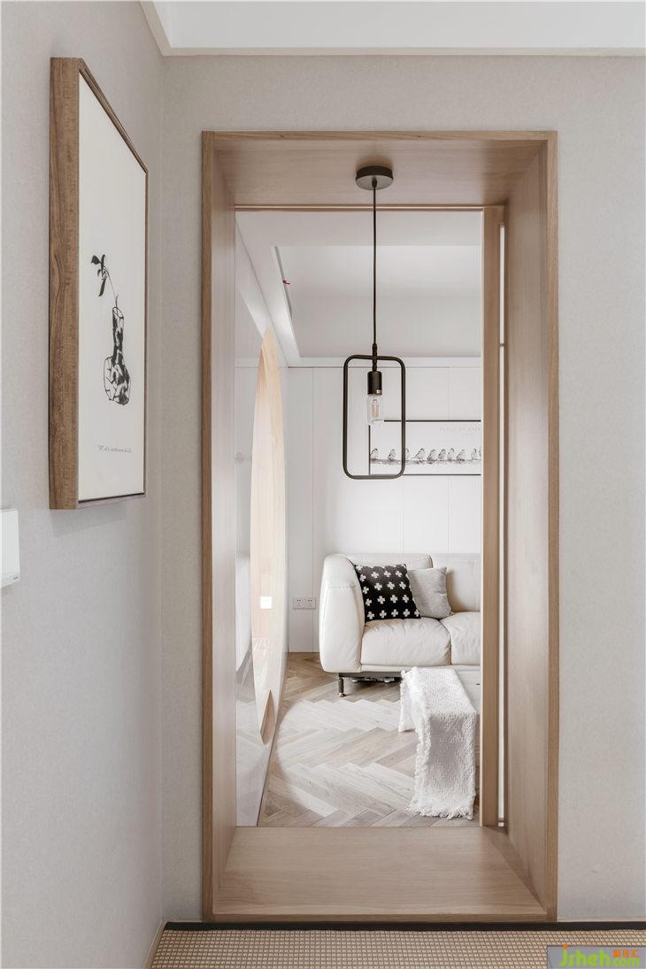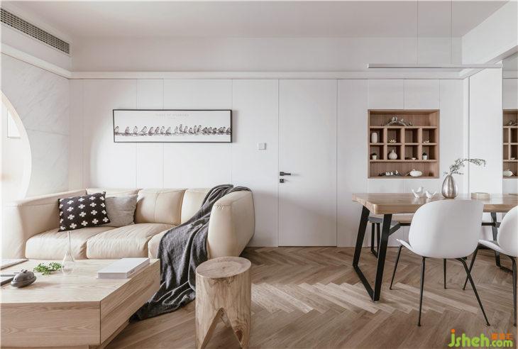 客廳地面鋪設(shè)人字地板,門套以及移門皆使用和室風(fēng)格的木質(zhì)材料,沙發(fā)背景墻白色護(hù)墻,豎向抽縫,與主臥門材質(zhì)統(tǒng)一,融為一體;客廳陽臺飄窗,是最佳的觀景空間,我們將飄窗打造為一個休閑空間,讓這里成為品茶閱讀的休閑觀景臺。