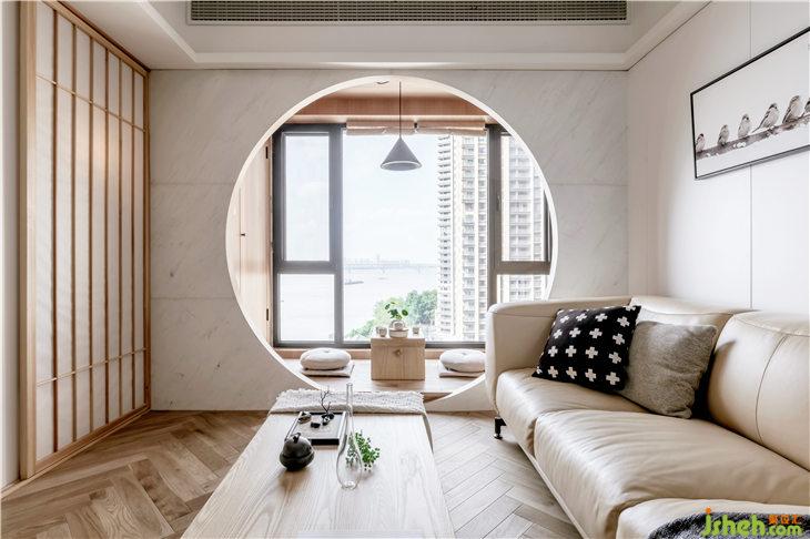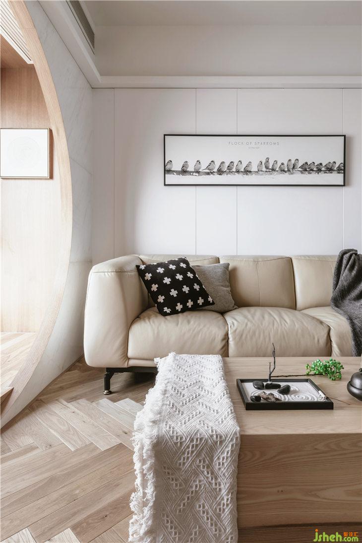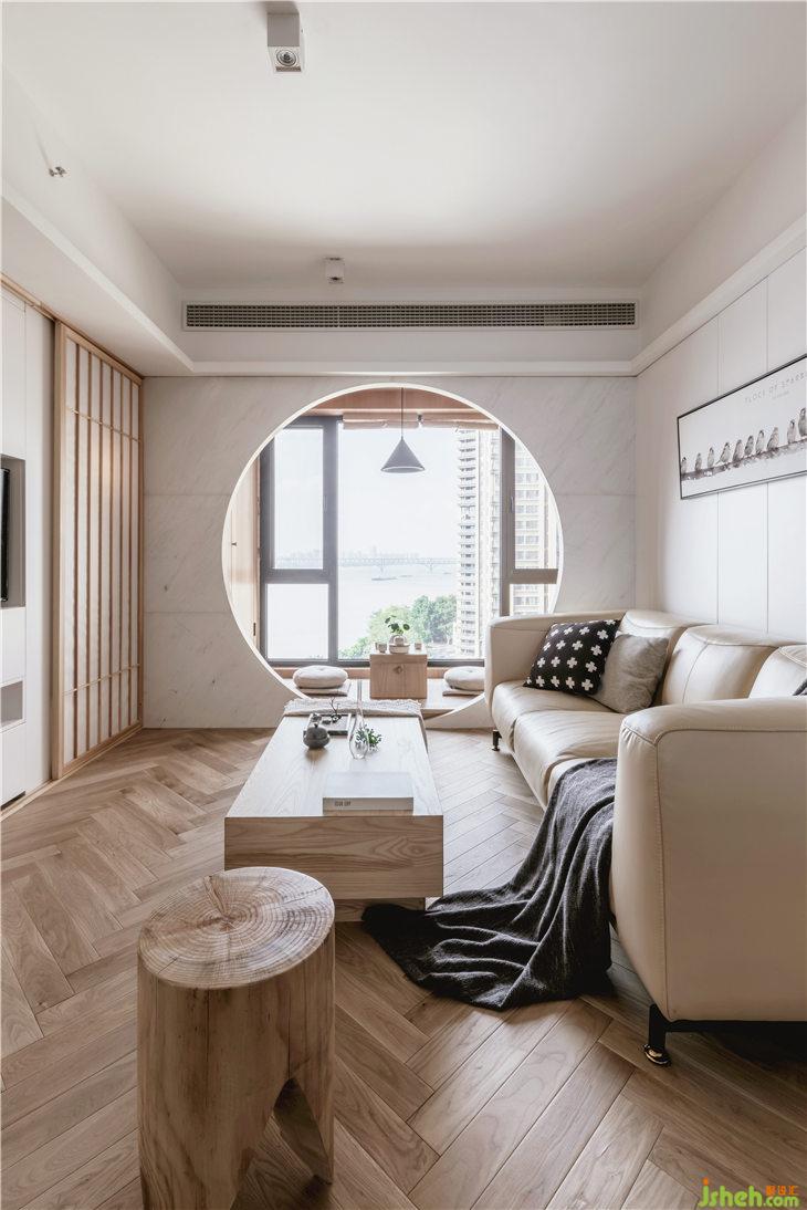 在客廳的飄窗設(shè)計了圓拱造型,形成了圓形的取景框,營造一種富有詩意的畫面感。整個空間的木色飾面,使用KD板材料,更加細(xì)膩和整體。