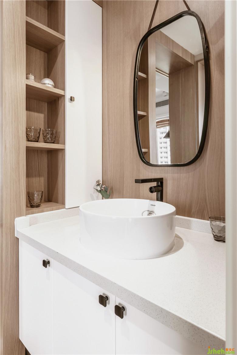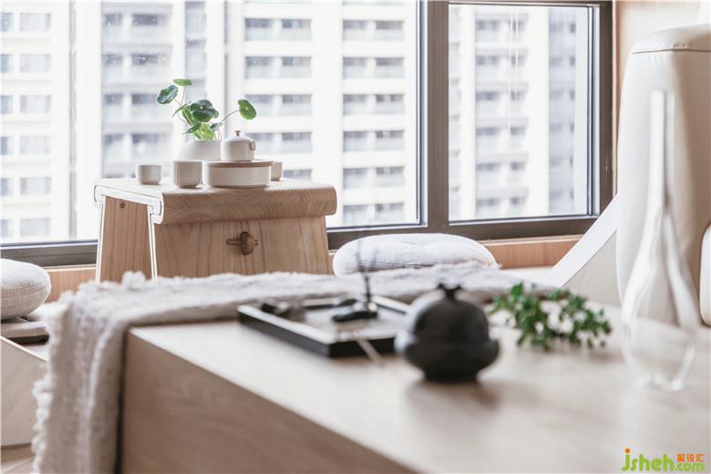 客廳地面鋪設(shè)人字地板,門套以及移門皆使用和室風(fēng)格的木質(zhì)材料,沙發(fā)背景墻白色護墻,豎向抽縫,與主臥門材質(zhì)統(tǒng)一,融為一體