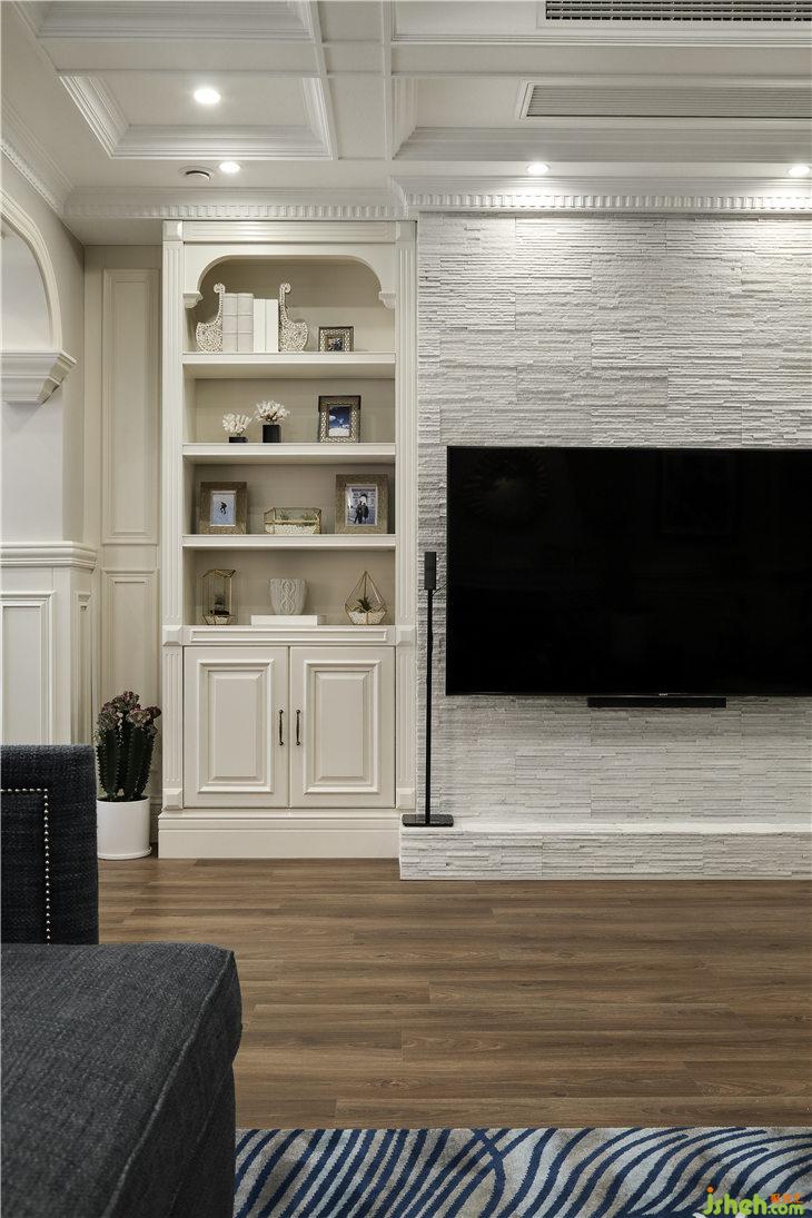 電視背景墻使用了肌理豐富的白色文化石,搭配兩側(cè)定制的米白色展示柜,展示柜是展示一家人生活、旅行記憶的小天地。