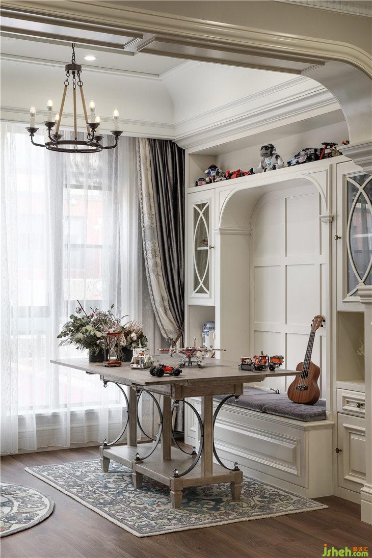餐廳的家具,來自美克美家ART系列,米灰色調(diào)的復(fù)古美式風(fēng)格,褪去了傳統(tǒng)美式家具冗雜的造型,與我們經(jīng)典美式硬裝基調(diào)完美的融合。