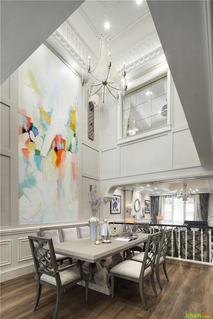 餐廳的挑高空間是房子的亮點(diǎn),穹頂造型多層次的細(xì)節(jié)描繪出餐廳恢弘的挑高氣質(zhì),3m大水晶吊燈在各方位角度點(diǎn)亮了晶瑩剔透的氣質(zhì)。二樓兩側(cè)分別是次臥和孩子的學(xué)習(xí)房,為了保證餐廳的采光,我們使用固定的超窄邊框玻璃窗。餐廳背景是一幅定制的抽象壁畫,瀟灑的筆畫搭配明度較高的顏料,在整個(gè)灰度空間絢麗奪目。