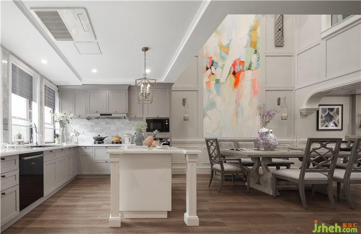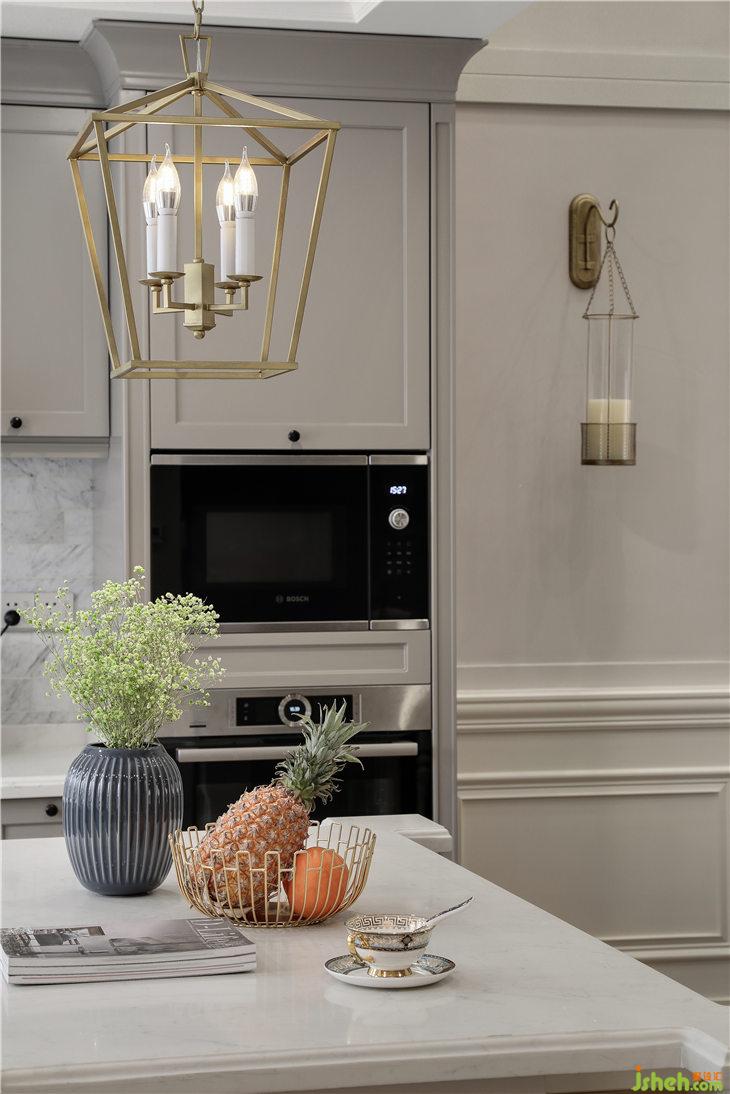 內(nèi)嵌的電器高柜美觀大氣,與餐桌位置相鄰,方便廚房與餐廳空間的使用。