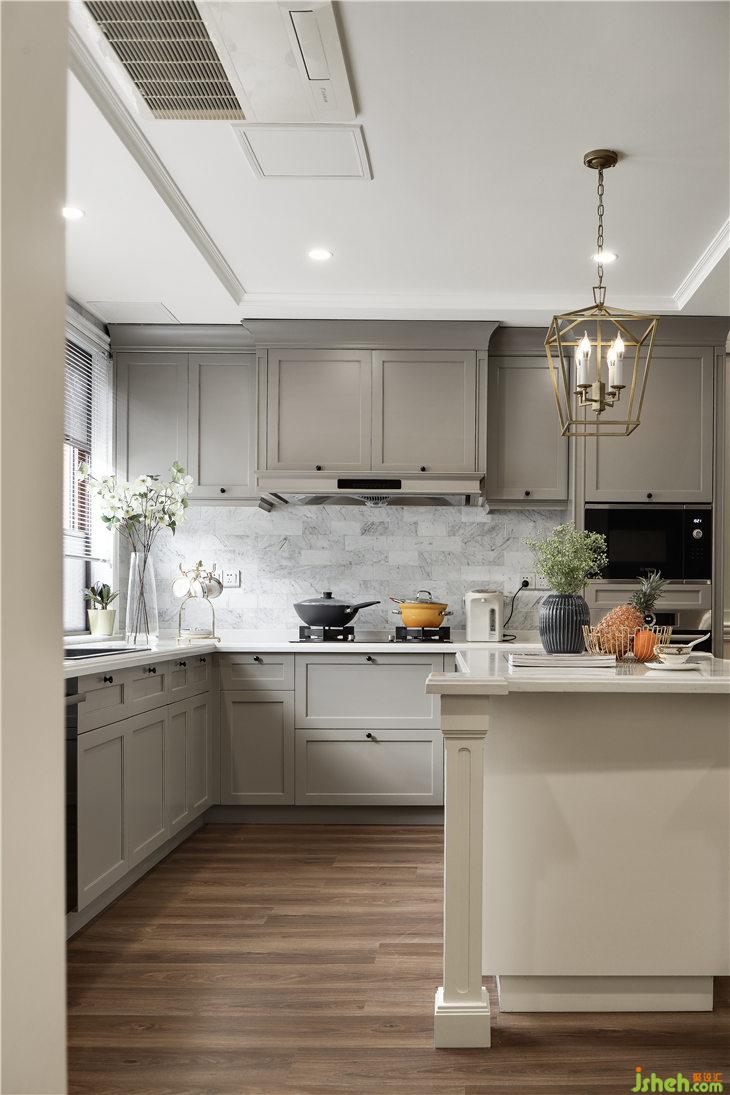 一進(jìn)門,開放式廚房便映入眼簾。墻面大理石瓷磚紋理精致耐看,灰色系的櫥柜柔和淡雅,L型臺(tái)面加上島臺(tái)操作空間十足。島臺(tái)下方做成柜體,增加了廚房的整體收納。