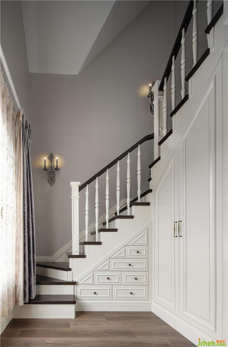 這里是通往頂樓衣帽間的樓梯間,樓梯下方我們也充分利用,定制了抽屜柜,增加儲(chǔ)藏,點(diǎn)綴式的把手精致了一個(gè)樓梯間。