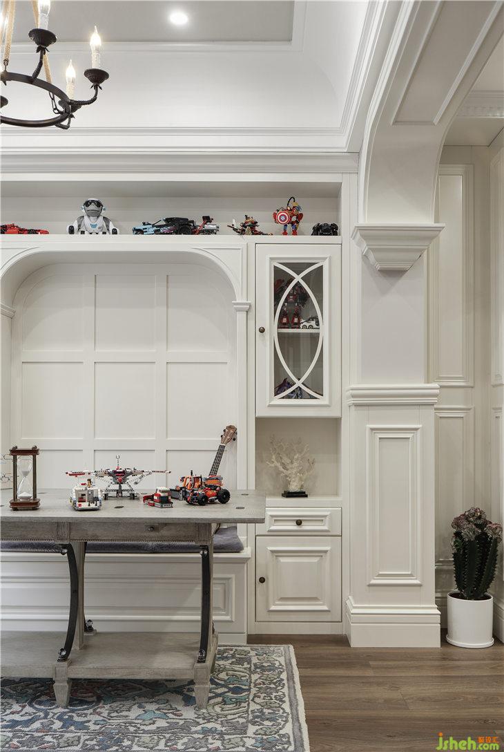 卡座下方及兩側(cè)設(shè)計(jì)了儲(chǔ)物柜,充分利用了空間,米白色的護(hù)墻及門板均采用經(jīng)典美式造型。