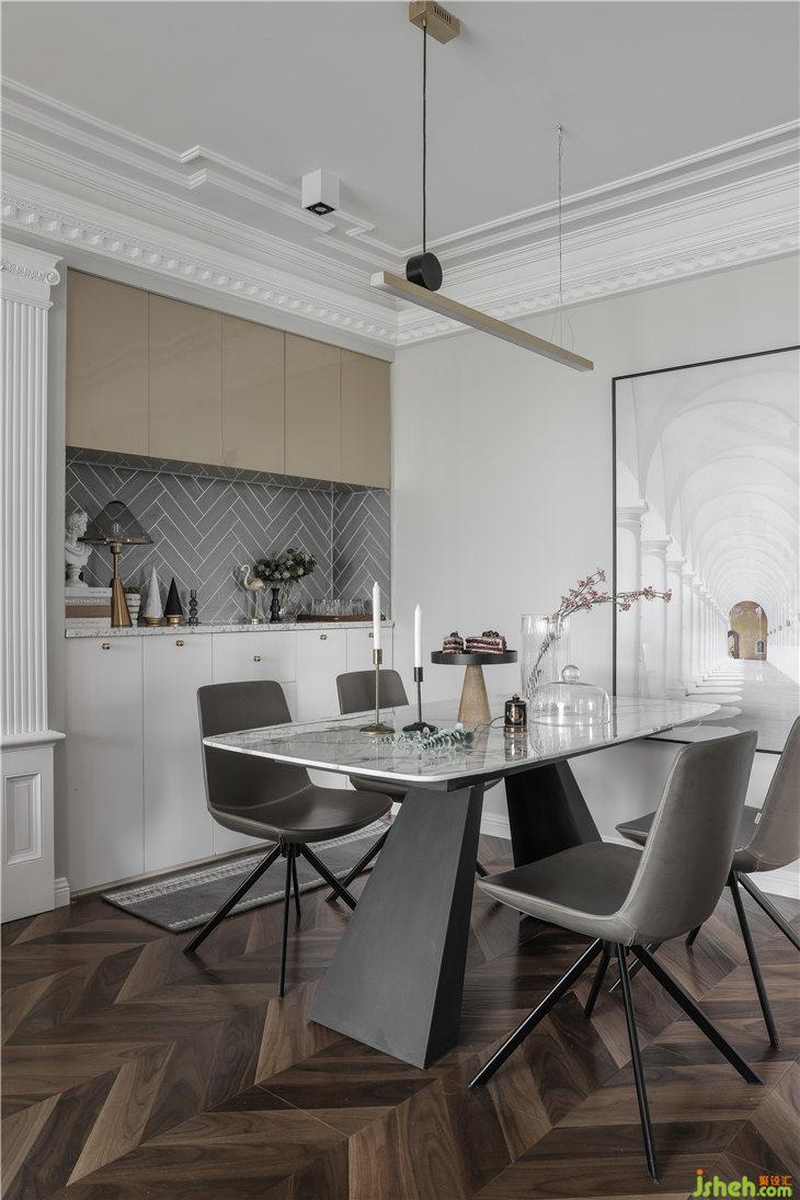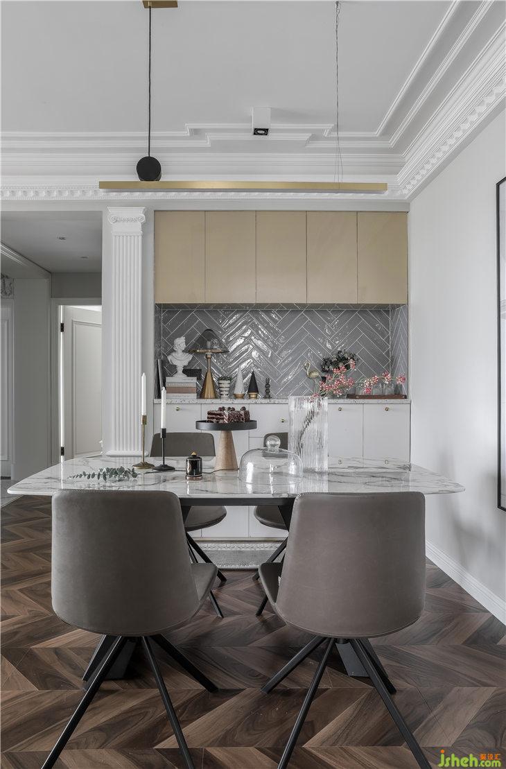 打開入戶門,就是我們的餐廳空間,與客廳貫通,保留了原有的層高,燈具均采用明裝形式,復古石膏造型疊級與客廳造型整體設(shè)計,形成一體;我們將靠南側(cè)的一面墻取消,設(shè)置了一個餐邊柜,這樣在不占用餐廳空間的前提下,增加了餐廳的操作與儲藏空間。