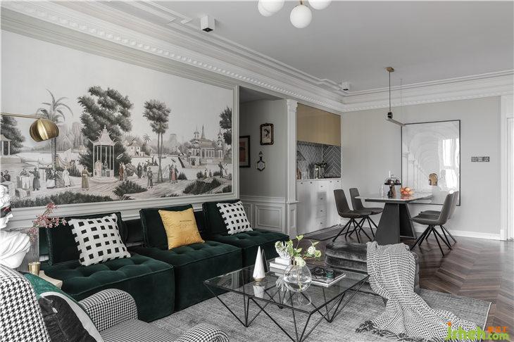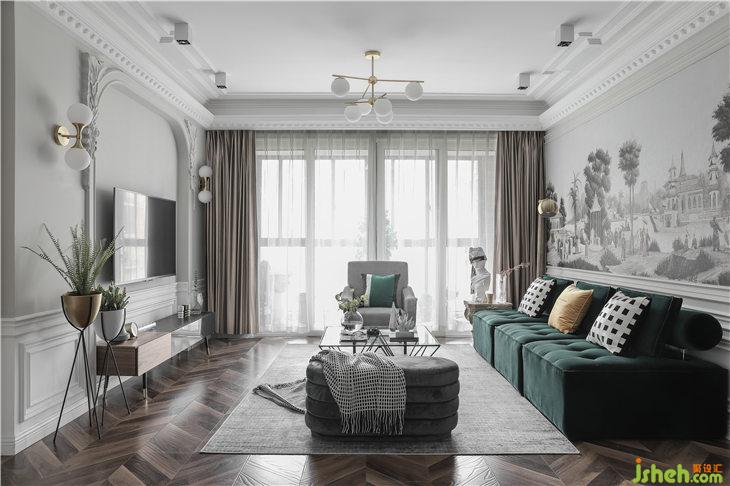 客廳的軟裝選擇上,我們用了經(jīng)典祖母綠的絲絨沙發(fā),搭配現(xiàn)代經(jīng)典造型的千鳥格單人沙發(fā)和灰色絨面弧形榻凳,營造了整體大氣卻不失精致感的雅致韻味。吊頂與電視背景墻壁燈,選用了同系列樣式,香檳金屬結(jié)合白磨砂燈泡,增添了高雅的氣質(zhì)。