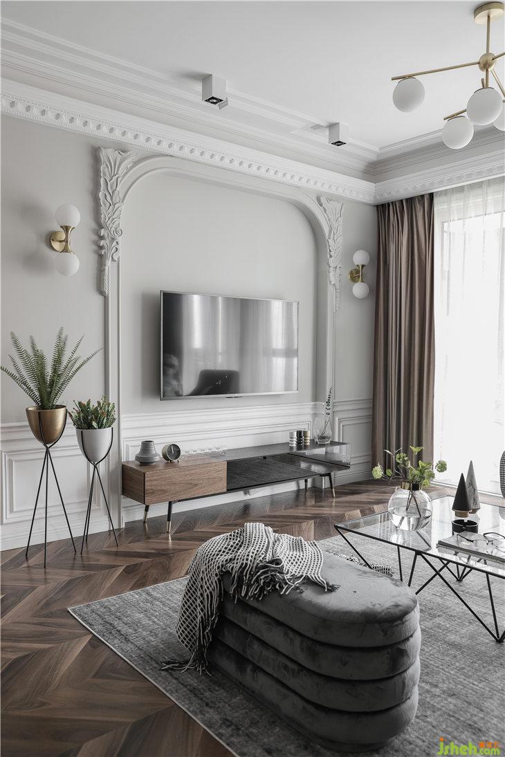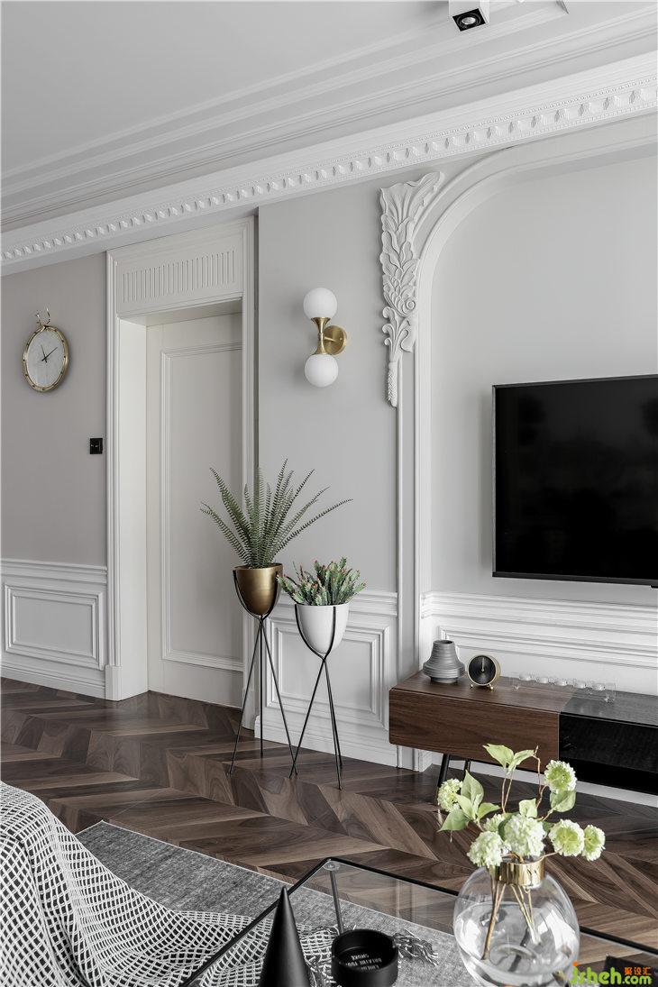 電視背景墻,原始結(jié)構(gòu)的一側(cè)有承重墻凸出,我們將相對一側(cè)同樣加厚拉平,中間形成一個框洞,使用PU線條進(jìn)行裝飾結(jié)合拱形角,扣上我們定制雕刻的一對石膏花角線(花角一個500大洋,電腦雕刻,只此一對),讓墻面更加豐富與生動。
