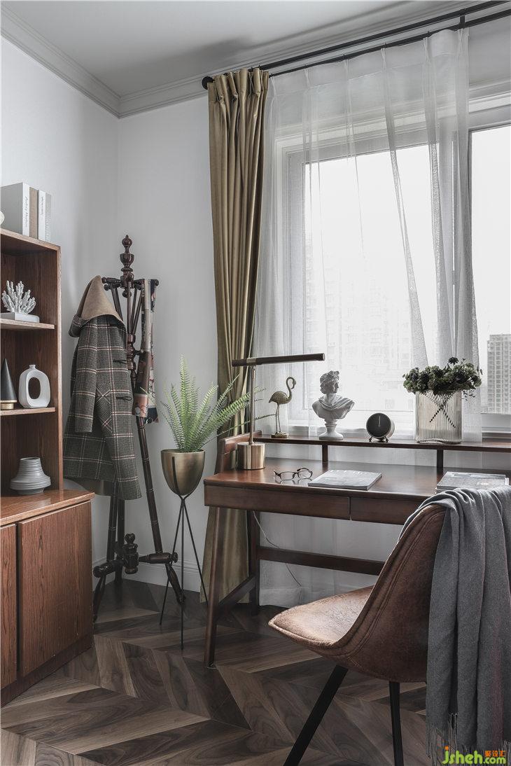 書房的一角,老房子搬來的書柜和新購的胡桃木書桌,并不顯得沖突,吊頂涂灰,墻面留白,每一處的擺設(shè)都是懷舊的味道。