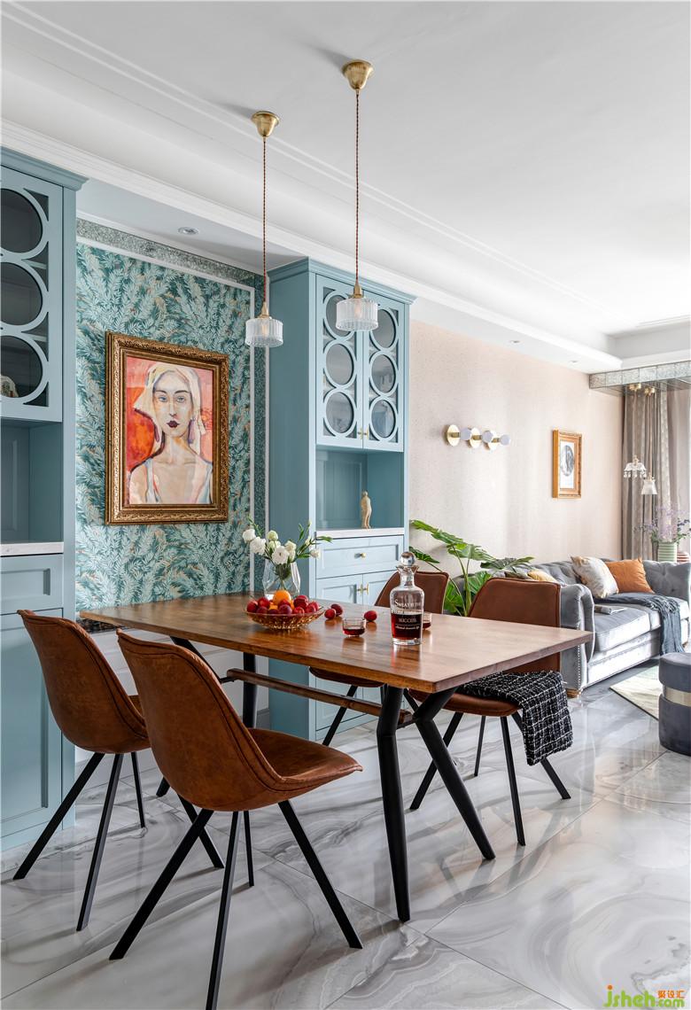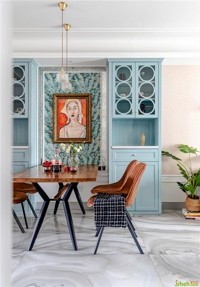 餐廳與客廳通長,餐廳設(shè)計(jì)了一組對(duì)稱的酒柜,劃出餐廳的界限,集收納與展示一體,柜體間內(nèi)嵌一面背景墻,選用了另一款與柜體同色系的壁紙,四周使用復(fù)古鏡面玻璃收邊,材質(zhì)的變化更替,也讓空間層次更加豐富。