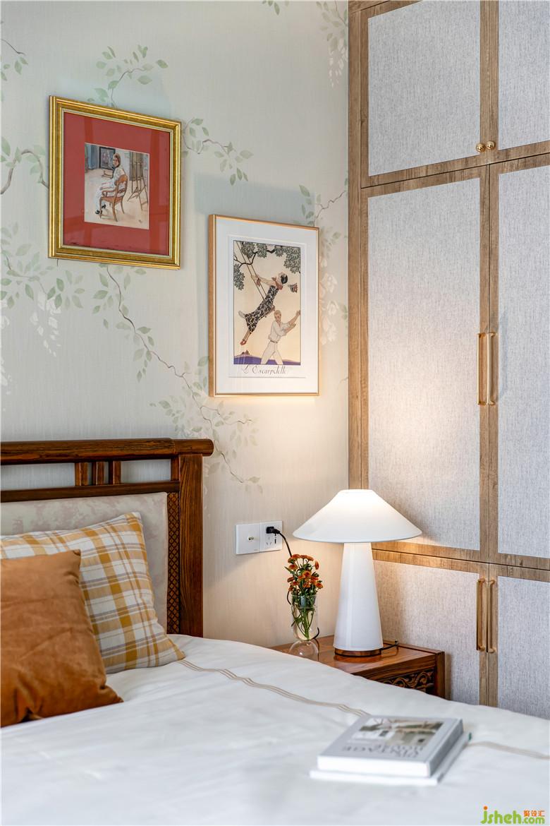 主臥的衣柜柜門,特別設(shè)計(jì)定制,木色邊框,布藝感飾面,與紅木家具配合使用。
