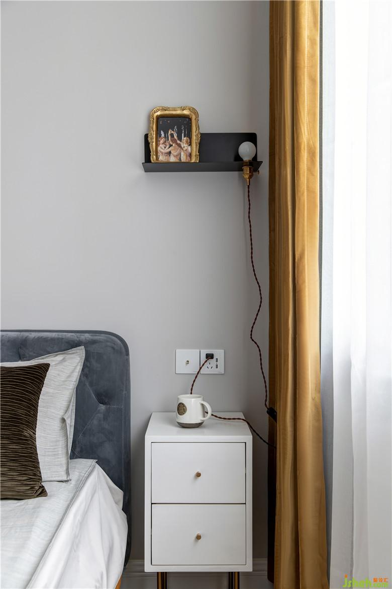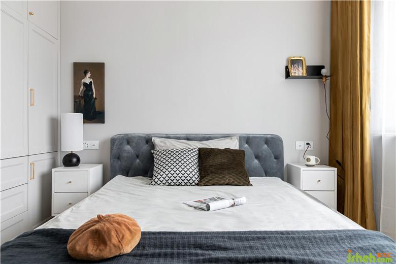 次臥色調(diào)則整體淡雅,素色的乳膠漆墻面搭配簡(jiǎn)單的裝飾,香檳色的柜門把手和鵝黃色絨布窗簾,讓空間更顯雅致。