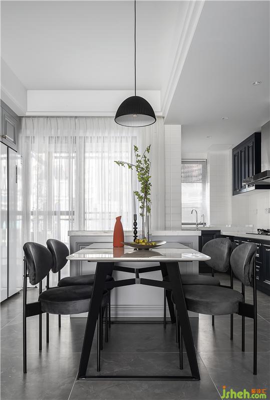 餐廳與生活陽臺相連,采光十分通透。餐柜的設計,不僅解決了最基本的收納問題,而且還提前預留了一個冰箱位,加上利用矮柜布置的操作臺,實現(xiàn)了強大的使用功能。