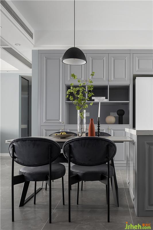 餐桌椅簡約而不簡單,深色的結構有著美式獨有的沉穩(wěn)氣質。線條感十足的美式柜子,再輔以裝飾畫和桌面的綠植插花,就餐氛圍瞬時優(yōu)雅起來。