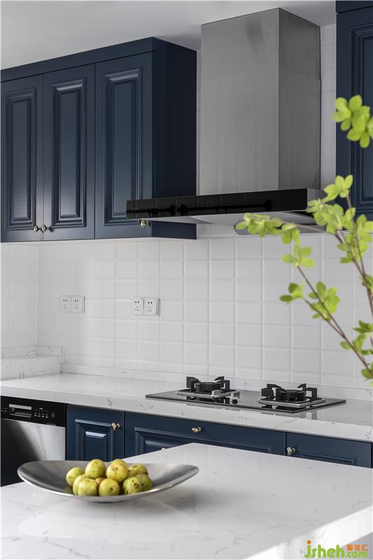 來到廚房,清新的色彩搭配耳目一新。簡約的櫥柜搭配淺色墻磚和石英石臺面,經(jīng)典而耐看。