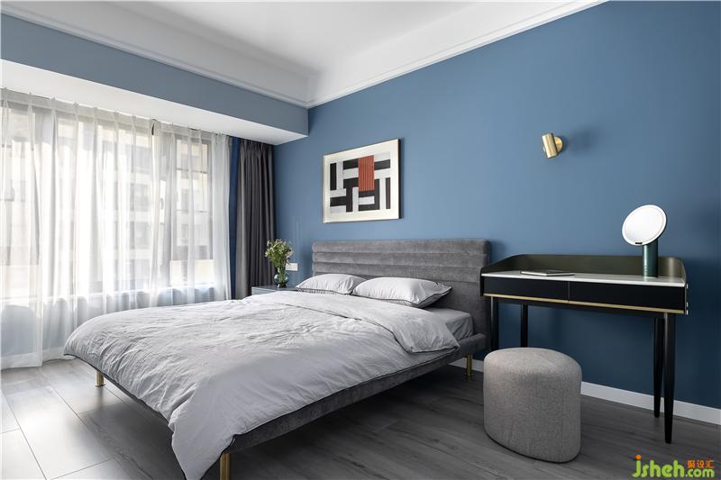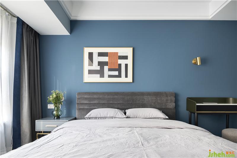藍(lán)色的背景墻加上簡約的裝飾畫,清新而大氣。深色的簡約大床呼應(yīng)睡眠空間的整體風(fēng)格,更顯穩(wěn)重大方。