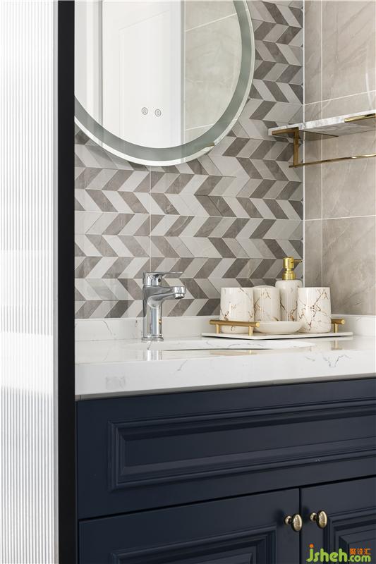 衛(wèi)浴空間墻面鋪滿魚骨形狀瓷磚,結(jié)合圓鏡和藍(lán)色的抽屜柜,優(yōu)雅之感應(yīng)運(yùn)而生。