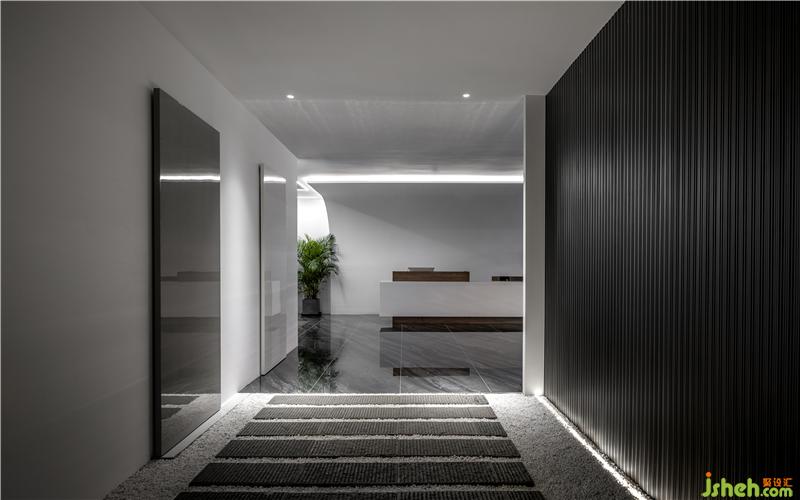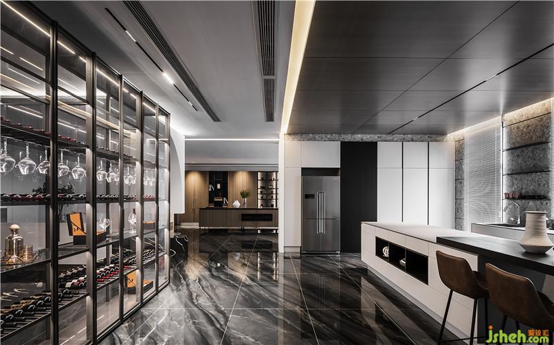 前臺頂面整墻的弧形石膏板吊頂,整個空間線條流暢,頗具設計感。右邊紅酒柜將空間分離又自帶修飾美感。