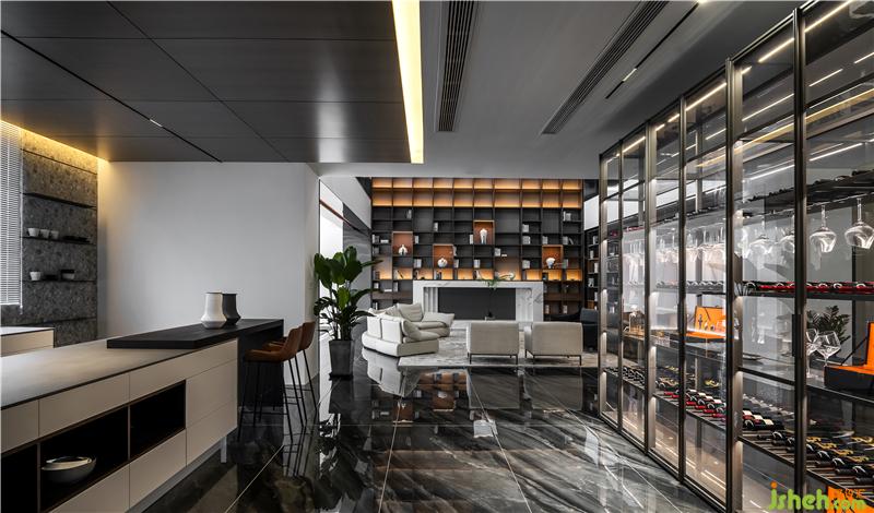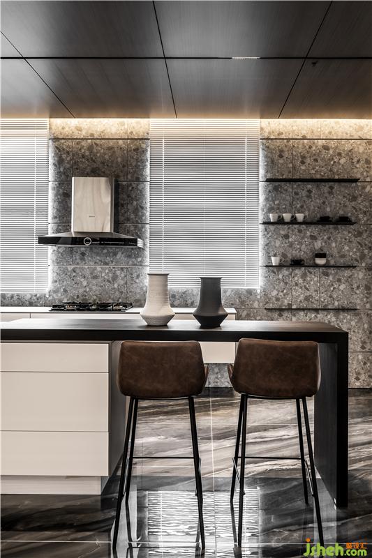 頂面平吊拉通視角,木質(zhì)櫥柜與黑色大長磚恰到好處的呼應(yīng),更能彰顯大氣沉穩(wěn)的現(xiàn)代居住空間。
