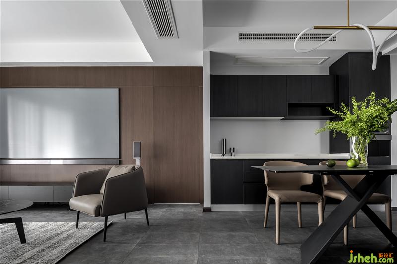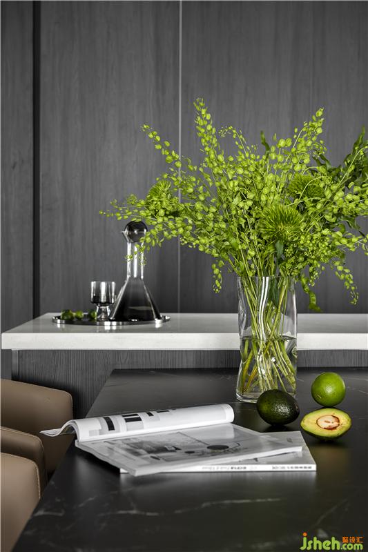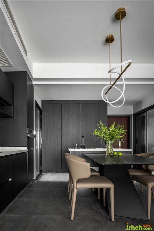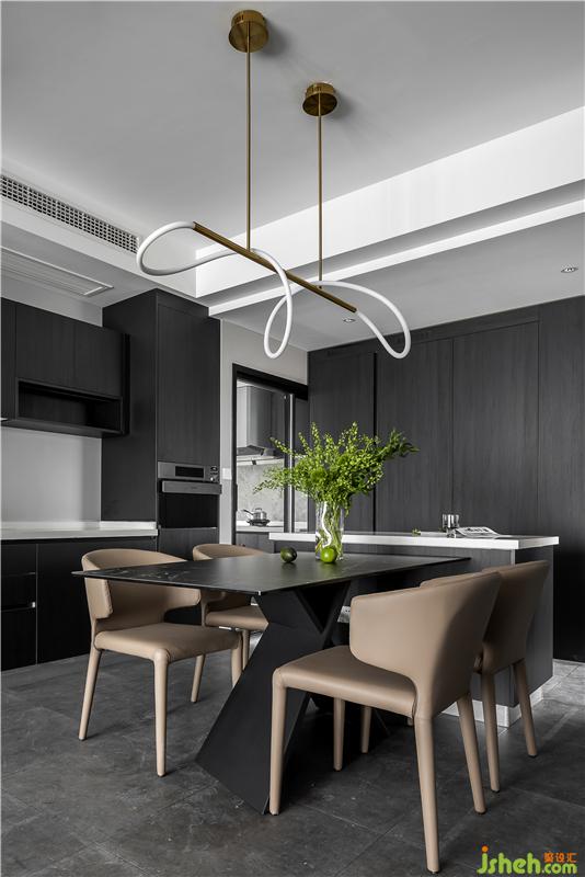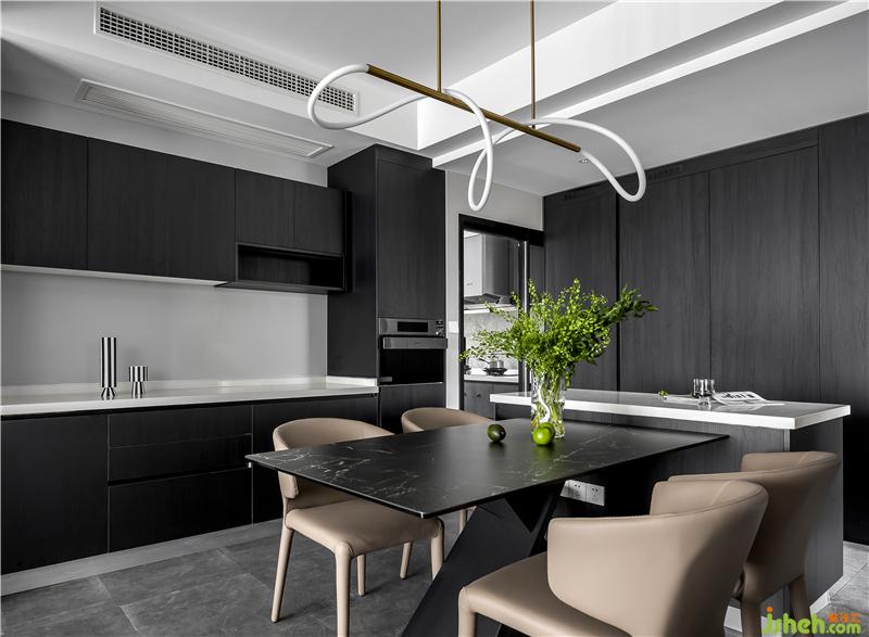 餐廳與西廚結(jié)合在一起,餐桌連接島臺(tái),方便操作,也增加時(shí)尚感