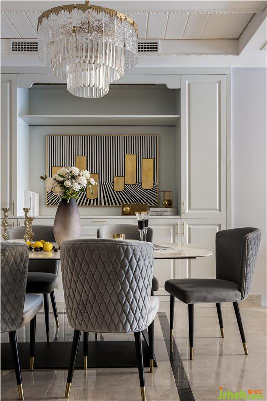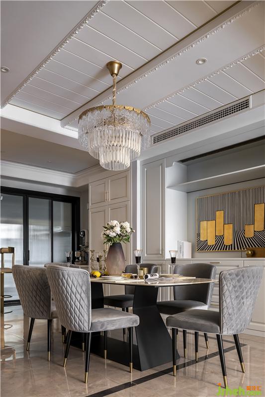 餐廳呈現(xiàn)的是冷暖相間的色彩,頂面優(yōu)美的線條,搭配圓形吊燈,置身其中感受到的是空間本身帶來的美.