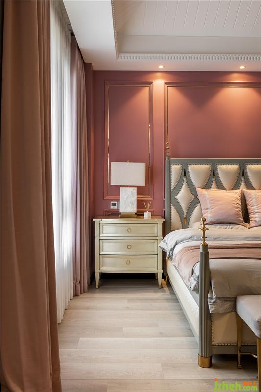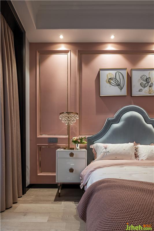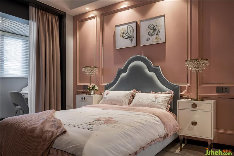 女兒房是精致夢(mèng)幻的,背景色是比主臥淺一點(diǎn)的藕粉,搭配灰藍(lán)色的床,溫柔的色彩為空間增添了寧靜。