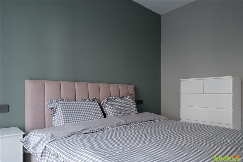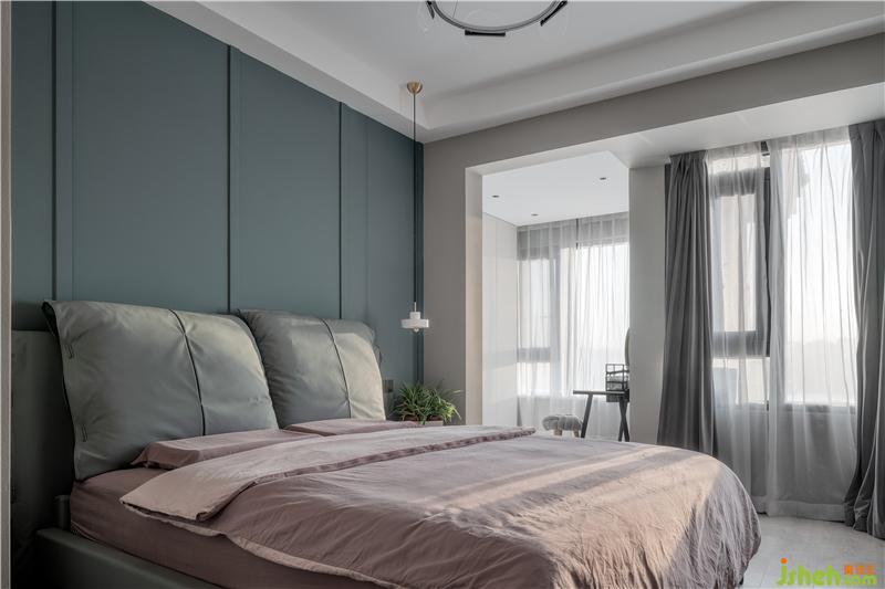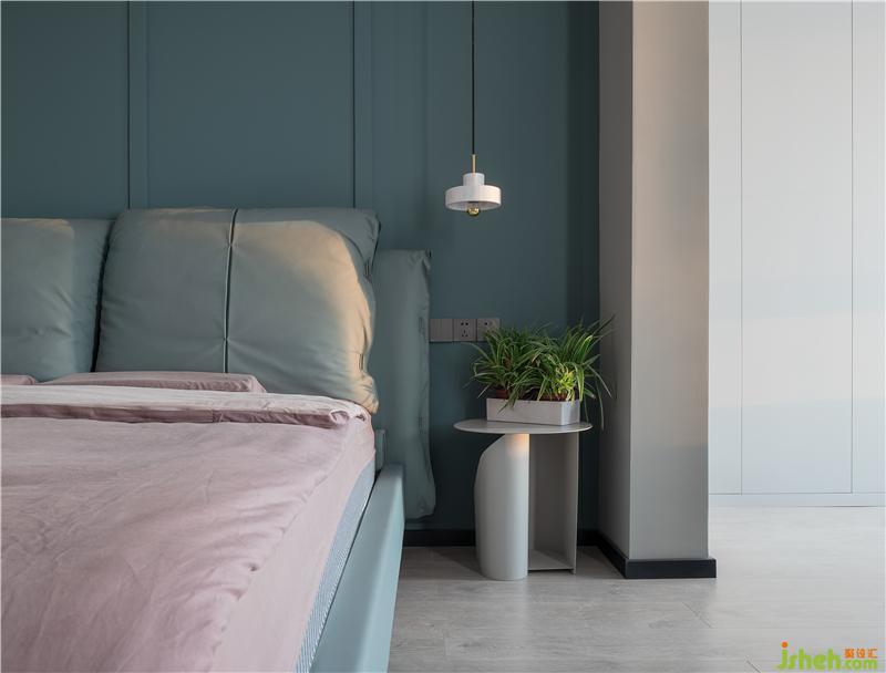 臥室寬大的床上鋪著柔軟舒適的床上用品,床頭背景墻沒有過多的裝飾,只是鋪滿了淡雅的藍色乳膠漆。造型簡約的床頭柜上擺放著臺燈和常用物品,室外的陽光透過玻璃窗灑進來,讓整個臥室都沐浴在陽光下,給人一種明亮溫暖的感覺。