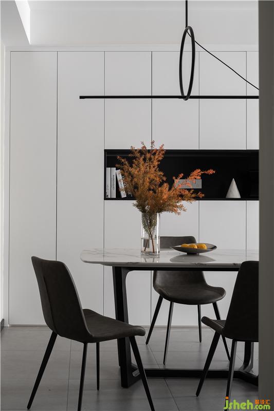 幾何一字型創(chuàng)意藝術(shù)吊燈簡(jiǎn)潔又不失大方,裝修設(shè)計(jì)搭配大理石餐桌,更具活力。餐邊柜與儲(chǔ)物柜結(jié)合,既能作為家庭儲(chǔ)物收納也能作為飾品展示區(qū)域,美觀實(shí)用。