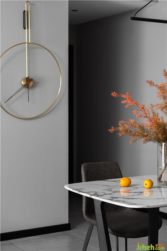 客廳的大落地窗讓室外的景色透進(jìn)來,整個(gè)空間更加明亮、通透。泡上一壺茶,用心感受遲暮與朝霞的魅力。懸掛在墻上的圓形個(gè)性裝飾鐘,為客廳平添了一絲藝術(shù)氣息。