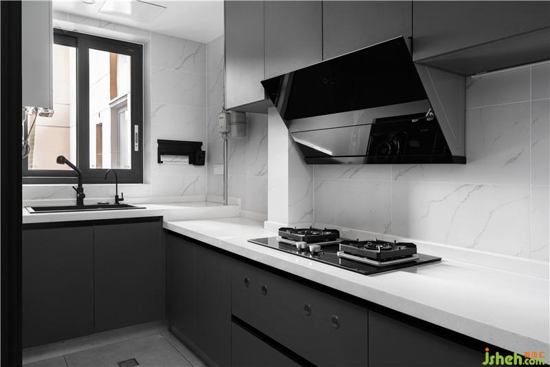 l型廚房沿用了大理石瓷磚,搭配灰色櫥柜,層次分明,視覺上充滿流暢的美感,也增強(qiáng)了廚房的兼容性。