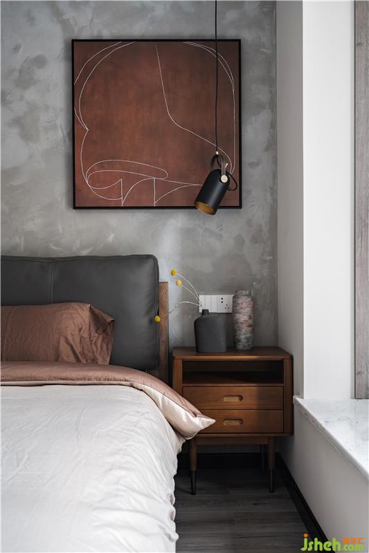 主臥室采用了水泥漆背景墻,胡桃色的裝飾畫與床品相呼應(yīng),皮質(zhì)軟包的床頭造型、黑色的吊燈,為睡眠空間點(diǎn)綴了一些工業(yè)風(fēng),簡(jiǎn)單且富有神秘感。