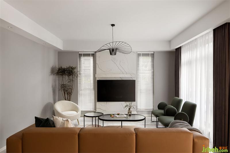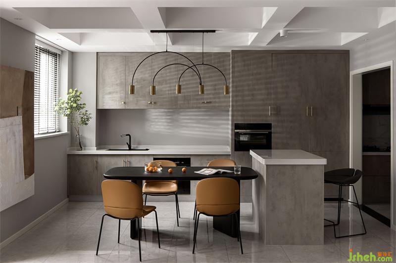“島臺(tái)+餐桌”的設(shè)計(jì),時(shí)尚又大方,橙色桌椅搭配灰色餐桌,總是會(huì)讓人忍不住多看兩眼,弧形的吊燈,提升了空間的質(zhì)感,簡約不簡單。