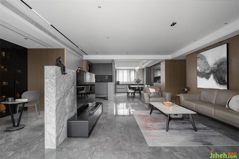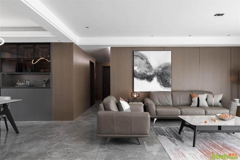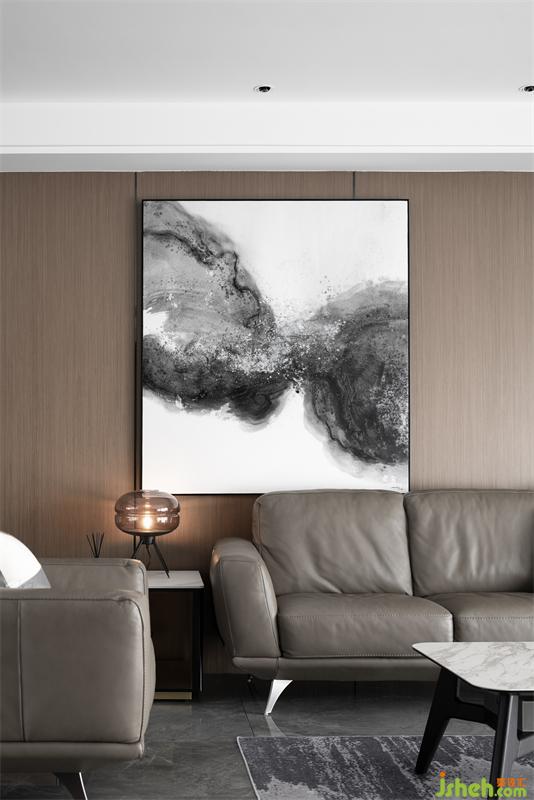 人間燈火無不休,愛于山水與春秋。一漣漣的褶皺窗紗隨著微風(fēng)輕拂,木色的飾面板通鋪整個墻面,灰棕色的皮質(zhì)沙發(fā)與整個客廳融為一體,極具中國風(fēng)的水墨畫躍然紙上,靈動又盡顯張力。