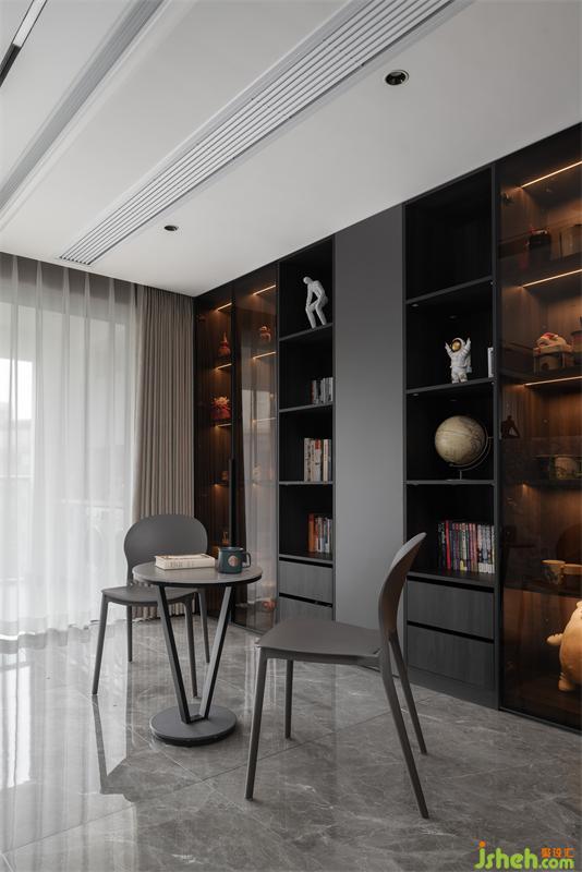 書柜不僅僅有儲物功能,造型各異的擺件更是點綴出了一絲神秘感,純黑色的柜體彌漫著淡淡的高貴氣息。業(yè)主是星巴克杯子的收集愛好者,柜子里藏滿了淘回家的杯子,同時,他也是一個細(xì)心又好客的人,會為來到家的朋友備好專屬的咖啡杯。
