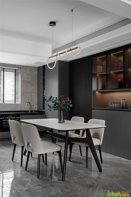 簡約深色的豎柵格板,整齊劃一,既美觀又讓空間質(zhì)感更豐富。通頂?shù)牟瓦吂?,方便放置精致的器皿、餐具、美酒,美觀而實用。