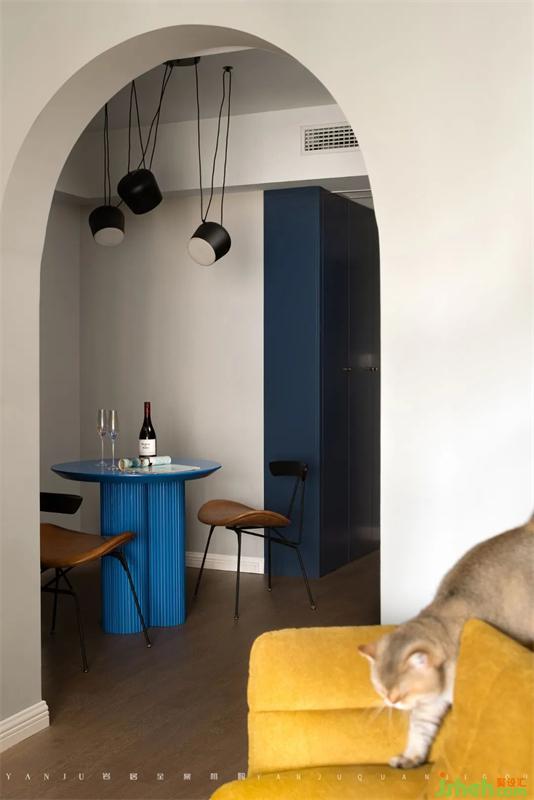 拱門的設(shè)計讓光源充分引入餐廳,整屋大量使用業(yè)主喜歡的金色、藍(lán)色、黃色元素,視覺上鮮明而不過分耀眼。